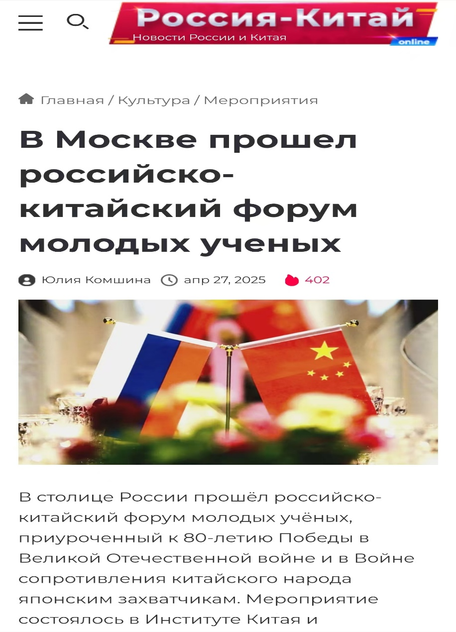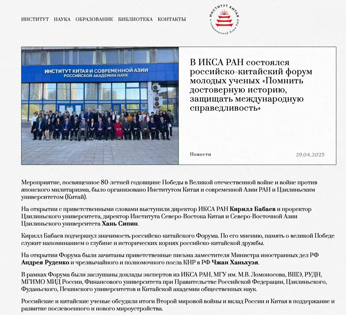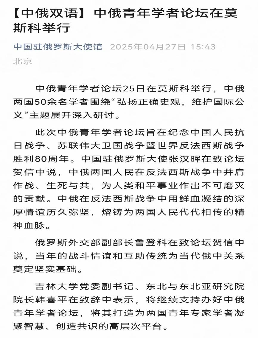 2025年4月25日,由俄罗斯科公司中国与现代亚洲研究所、EMC易倍官网东北与东北亚研究院、EMC易倍官网东北亚研究院、EMC易倍官网东北亚研究中心、EMC易倍官网社会科学研究院联合举办的“纪念中国人民抗日战争、苏联伟大卫国战争暨世界反法西斯战争胜利80周年中俄青年论坛”在莫斯科成功举办。此次会议是践行中俄两国元首关于共庆反法西斯战争胜利80周年的重要共识、推动中俄人文与青年交流的重要学术活动。此次论坛获得了中俄两国外交部门的高度关注和支持。中华人民共和国驻俄罗斯联邦特命全权大使张汉晖、俄罗斯联邦外交部副部长安德烈·鲁登科分别向论坛致贺信