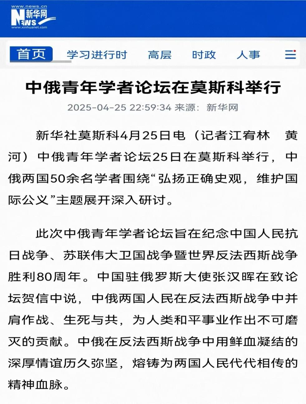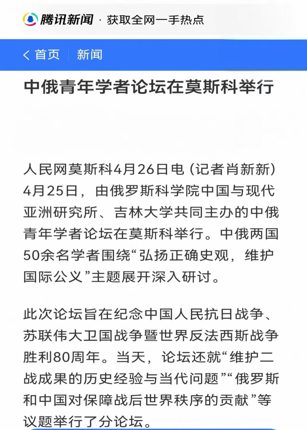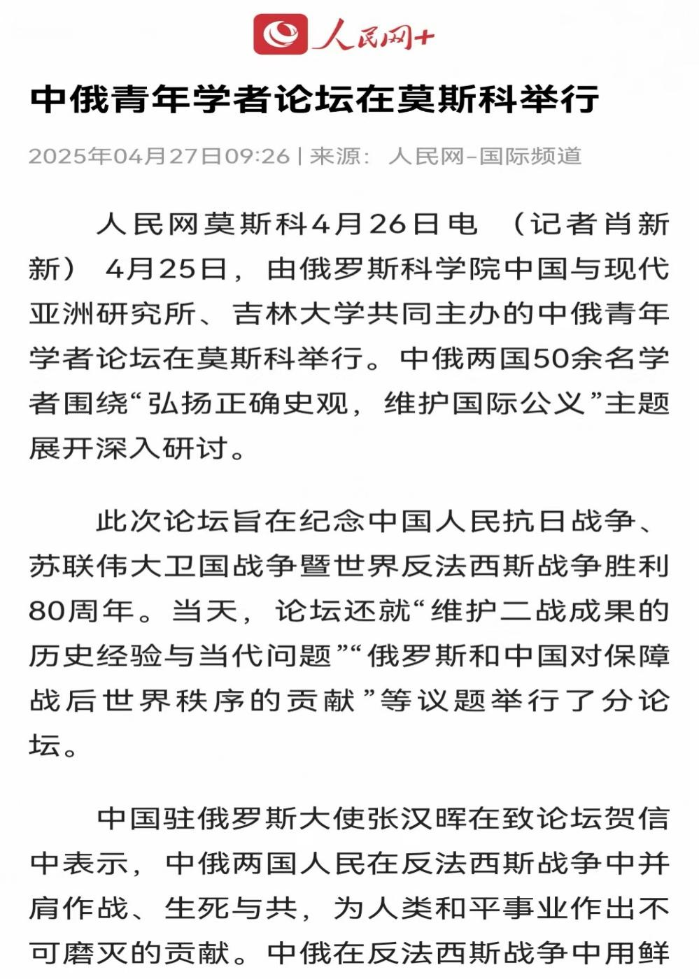 2025年4月25日,由俄罗斯科公司中国与现代亚洲研究所、EMC易倍官网东北与东北亚研究院、EMC易倍官网东北亚研究院、EMC易倍官网东北亚研究中心、EMC易倍官网社会科学研究院联合举办的“纪念中国人民抗日战争、苏联伟大卫国战争暨世界反法西斯战争胜利80周年中俄青年论坛”在莫斯科成功举办。此次会议是践行中俄两国元首关于共庆反法西斯战争胜利80周年的重要共识、推动中俄人文与青年交流的重要学术活动。此次论坛获得了中俄两国外交部门的高度关注和支持。中华人民共和国驻俄罗斯联邦特命全权大使张汉晖、俄罗斯联邦外交部副部长安德烈·鲁登科分别向论坛致贺信