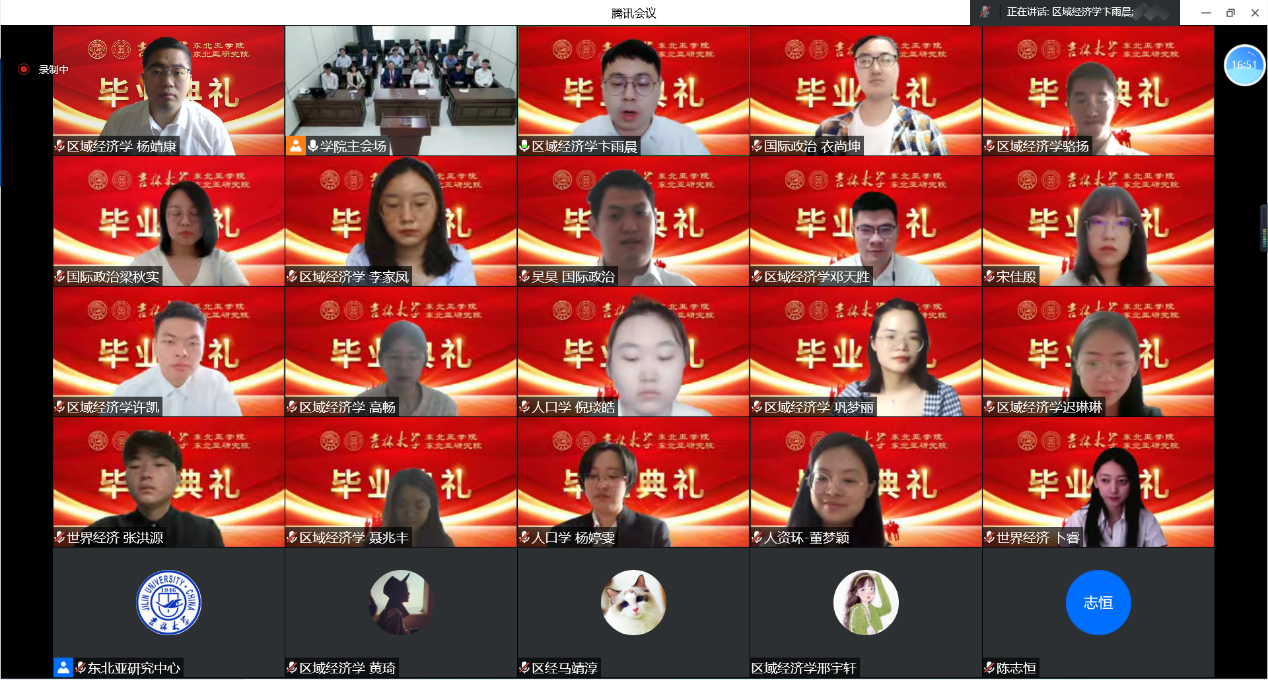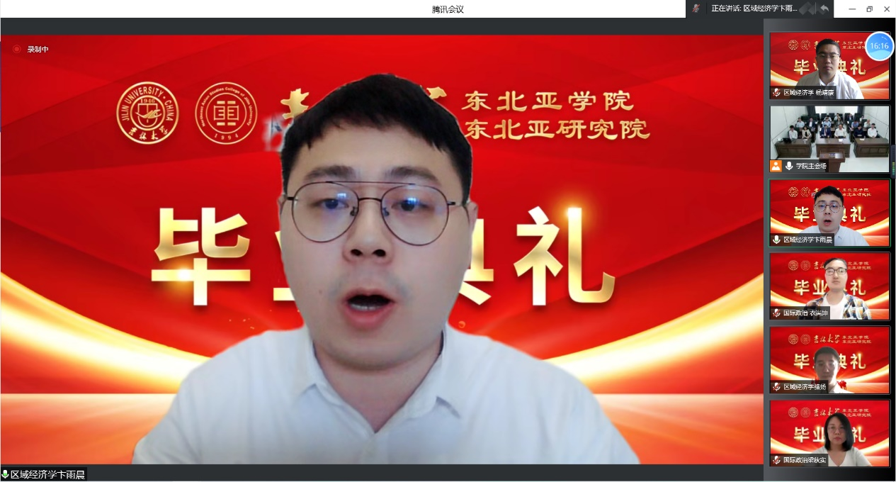 Liang Qiushi, representative of doctoral graduates, and Bian Yuchen, representative of master's graduates, expressed their gratitude to the college and teachers and their reluctance to part with fellow classmates, and said that they would keep in mind the JLU motto of "Truth· Innovation· Aspiration" and the patient instructions of teachers, and that no matter where they go in the future, they will show the world with the demeanor of students of Jilin University and Northeast Asian Studies College.