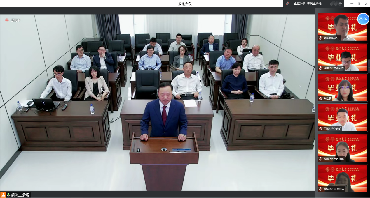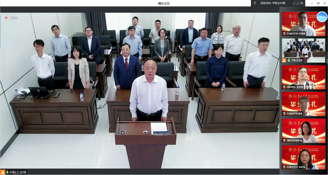 Accompanied by the rousing national anthem, the graduation ceremony officially began. Secretary Qiu Song first congratulated the students on their successful completion of their studies, and then approved the efforts and hard work of the instructors and students in overcoming the difficulties of the epidemic and successfully completing their studies. Finally, he expressed gratitude to the teachers and students for their contributions to the Northeast Asian Studies College.