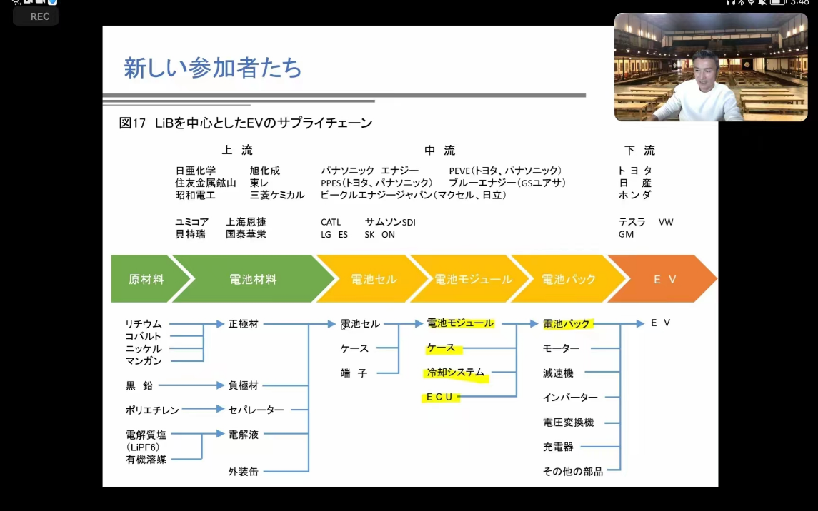Professor FUJIKAWA SHOGO focused on the globalization of the Japanese economy from the perspective of electric vehicle production. The lecture was divided into five parts: the first part analyzed the concepts of globalization and hollowing out; the second part introduced the situation of Japanese automakers who are shifting to electric vehicle production; the third part introduced the current situation of the Japanese electric vehicle supply chain; the fourth part introduced the future of Japanese electric vehicles; and the last part concluded with a summary.