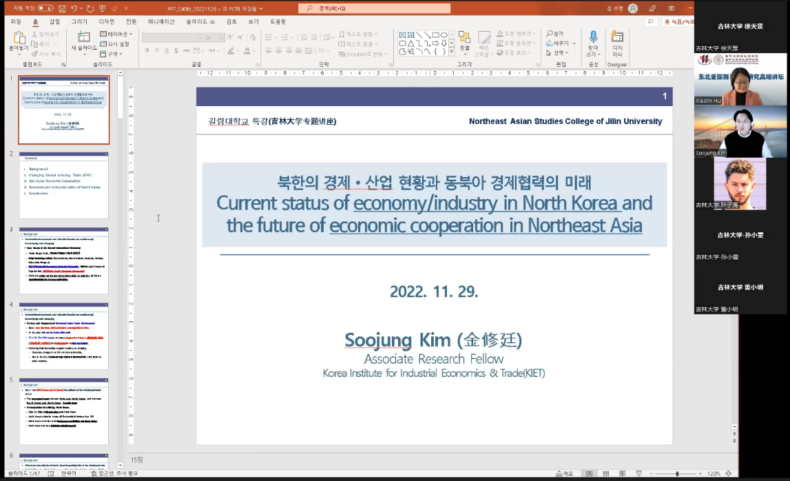 On November 29th, the lecture "Current Status of Economy/Industry in North Korea and the Future of Economic Cooperation in Northeast Asia" of the High-End Symposium on Northeast Asia International and Regional Studies was successfully held at Jilin University. The lecture was jointly organized by the Northeast Asian Research Center of Jilin University, the Northeast Asian Studies College of Jilin University and the Special Committee for Northeast Asian Regional Studies, Academic Association for International Cultural Exchange. The Northeast Asian Studies College of Jilin University invited Dr. Kim Soojung, a research member of the Korea Industrial Research Institute, to deliver the lecture. Associate Professor Xuan Chunji of the Northeast Asian Studies College of Jilin University hosted the lecture.