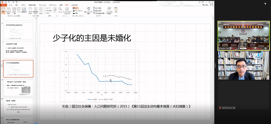 In his lecture, Professor Yuuki Mizoguchi pointed out that Japan has entered the stage of sub-replacement fertility and negative population growth, which has inflicted serious impact on Japanese economy. In his viewpoint, the reason for the first-phrase sub-replacement fertility before 1975 lies in the declining birthrate of married women while that for the second phrase after 1975 is the low marriage rate, the underlying cause of which, in turn, is the decline in the benefits of marriage and childbirth. Considering the development process of capitalism and the evolution of the Japanese family model, Professor Mizoguchi proposed that a new egalitarian family pattern that surpasses the gender difference should be constructed because with the development of capitalism, the Japanese family pattern has evolved from the traditional one to the modern one, where the work and family patterns supported by gender division of labor are not conducive to improving birthrate.