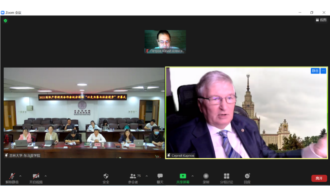 On September 15th , Learning from History and Progress with Society, a sub-forum of the 2021 International Conference on Cooperation in Industry, Academia, Research and Application(Changchun), was held at Jilin University, Humanities and Social Sciences Key Research Base of Ministry of Education, co-organized by the Northeast Asian Research Center of Jilin University, Northeast Asian Studies College of Jilin University, and Jilin University-Moscow State University History Research Center. Professor Cai Lidong, Vice President of Jilin University, Professor Wu Hao, Director of Northeast Asian Studies College and a professor of Kuang Yaming Distinguished Professor of Jilin University, Professor Zhang Guangxiang, Director of the Jilin University-Moscow State University History Research Center and a professor of Kuang Yaming Distinguished Professor of Jilin University, Academician С.P. Karpov, member of the Russian Academy of Sciences, Chairman of the Council of Heads of History Departments of Russian Universities, former Dean of Faculty of History, Moscow State University, Meritorious Professor, Honorary Professor of Jilin University, Academician Л.I. Borodkin, Corresponding Member of the Russian Academy of Sciences, Deputy Head of Faculty of History, Moscow State University, Honorary Professor of Jilin University, Professor С.V. Mironenko, Corresponding Member of the Russian Academy of Sciences, Russian State Archives Director, Professor Ю.A. Petrov, Director of the Institute of Russian History, Russian Academy of Sciences attended the forum. The opening ceremony of the forum was hosted by Professor Wu Hao.