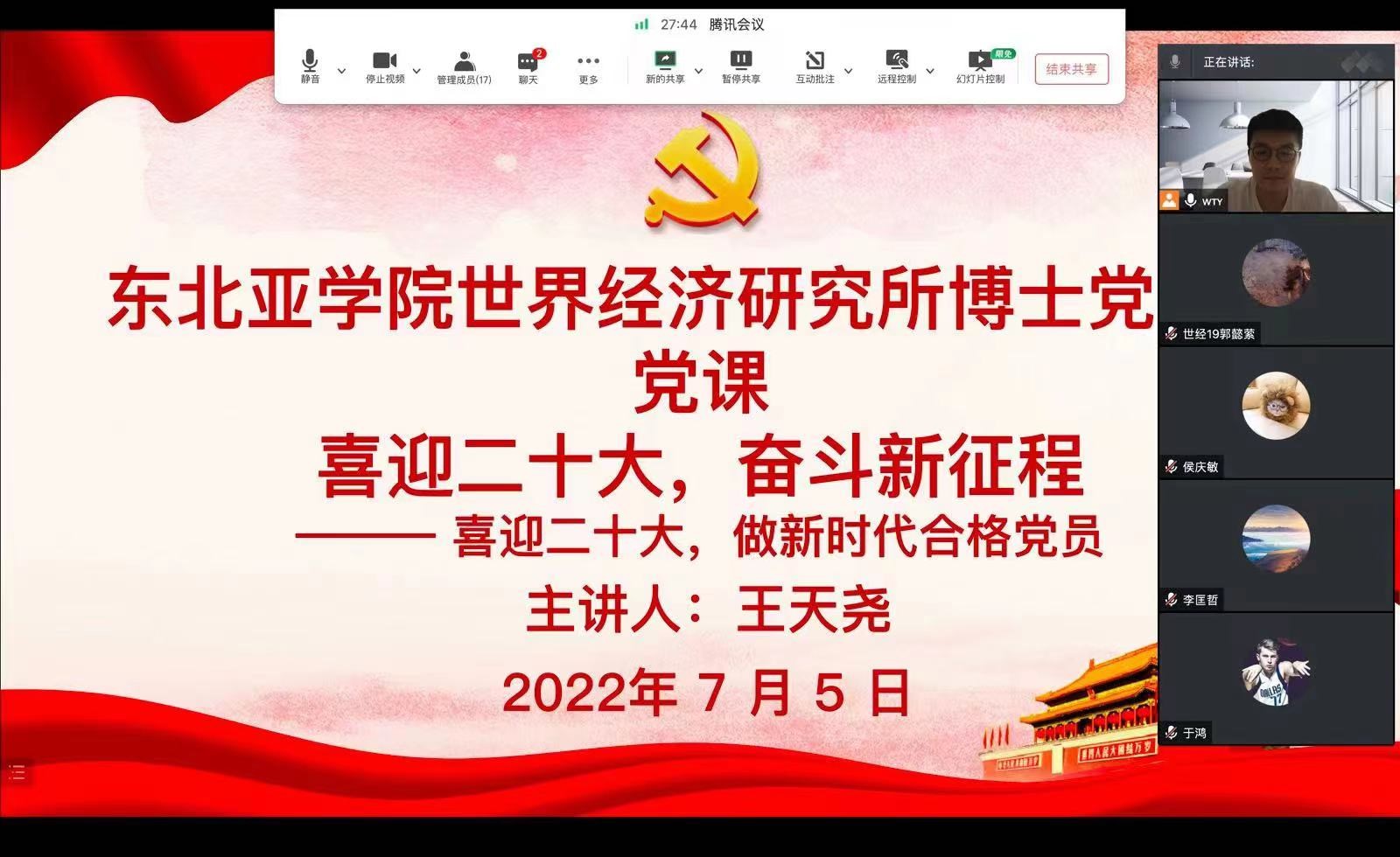 区域经济研究所博士员工党支部书记周昶同以“中国共产党历次全国代表大会回顾”为题讲党课,号召大家以青春之热血、青春之干劲,肩负起国家民族的希望,在中国共产党的领导下,与时代同心同向同行,不断前进。