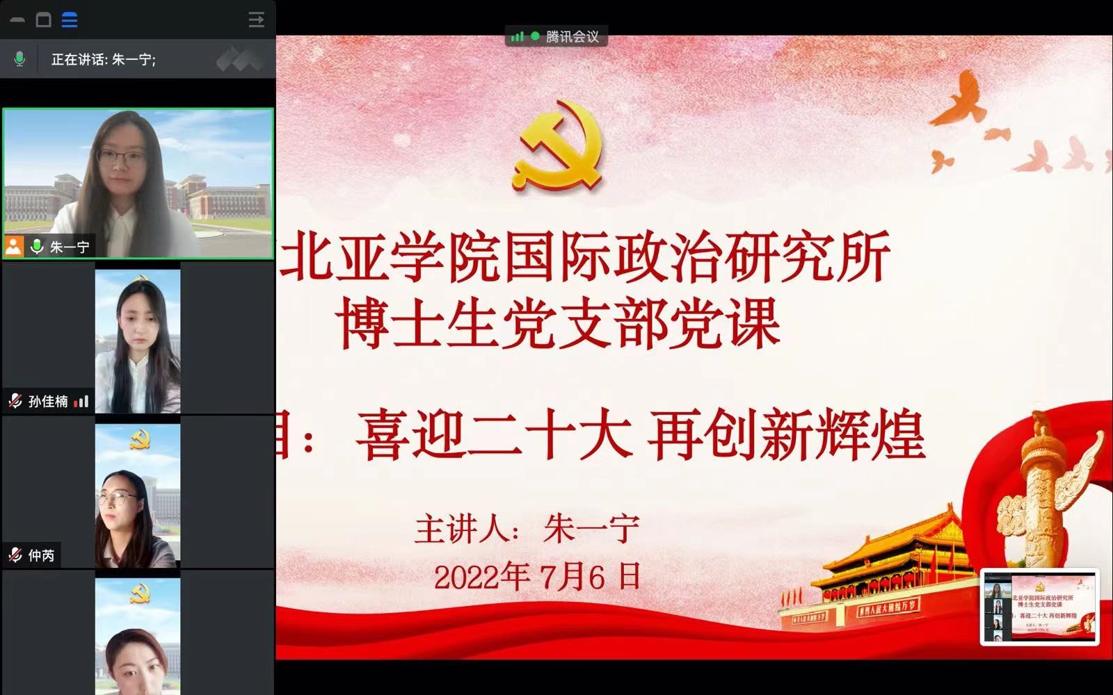 人口资源与环境研究所博士员工党支部书记尹豆豆以“坚定理想信念,坚守精神追求”为题讲党课,引导大家在社会课堂中“受教育、长才干、作贡献”,坚定信念听党话、跟党走。国际政治研究所博士员工党支部书记朱一宁以“喜迎二十大,再创新辉煌”为题讲党课,带领支部党员回顾了十九大以来我们党取得的突出成就,更加坚定了的理想信念。