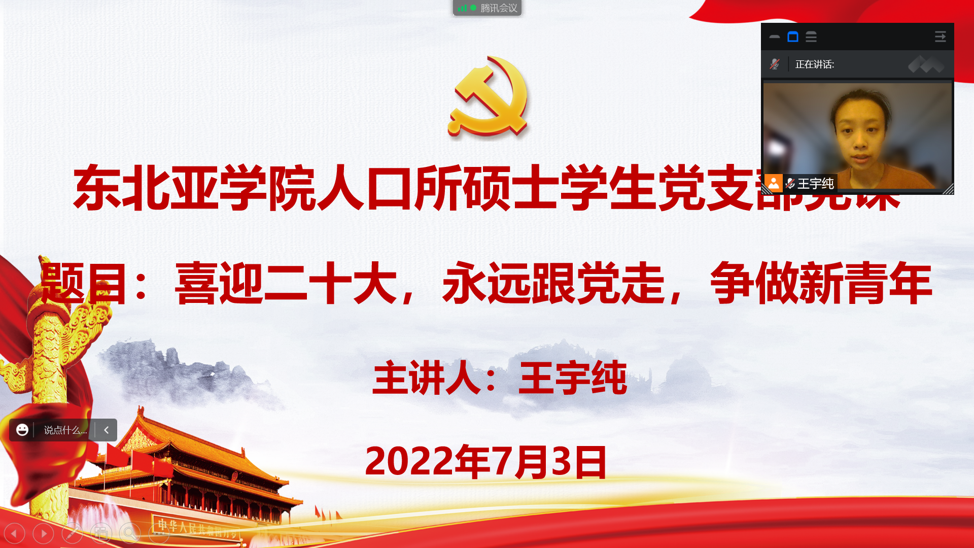 历史与文化研究所硕士员工党支部书记赵子恒以 “喜迎二十大,做好接班人”为题讲党课,人口资源与环境研究所硕士员工党支部书记王宇纯以“喜迎二十大、永远跟党走、争做新青年”为题讲党课,与支部党员同志一起重温了习近平总书记的一系列重要讲话,明确了青年党员的责任。青年一代是民族的希望,是国家的栋梁,肩负着祖国建设的重担。社会主义现代化需要青年去建设,中华民族的伟大复兴需要青年去奋斗。党员们纷纷表示,要立牢为国为民之志,淬炼奋勇担当之肩,保持砥砺奋斗之姿,增强干事成事之力。