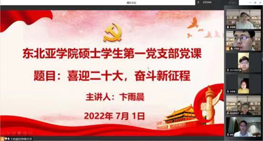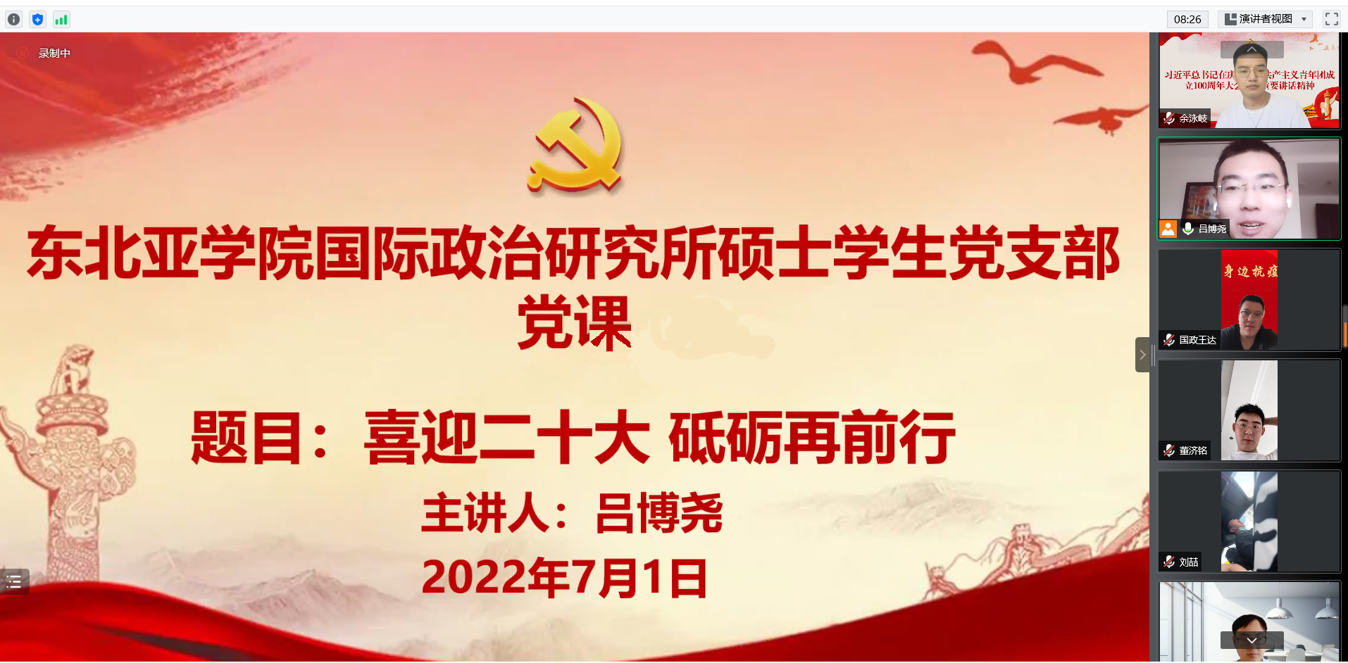 硕士员工第一党支部书记卞雨晨以“回顾光辉史,喜迎二十大,启航新征程”为题讲党课,国际政治研究所硕士员工党支部书记吕博尧以“喜迎二十大,砥砺再前行”为题讲党课,与支部党员一起回顾了中国共产党的光辉历史。支部全体党员一致表示,青年兴则国家兴,青年强则国家强,我们要立大志、勇担当、勤奋斗、长才干,不负时代使命,用理想之光照亮奋斗之路,用信仰之力开创美好未来。