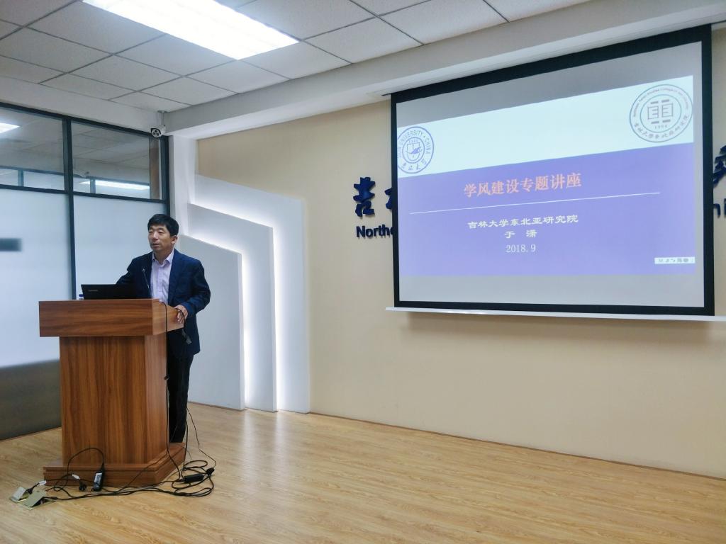 2018年8月27日上午,为了加强对员工全面素质的培养,提高员工的思想道德素质,东北亚研究院在东荣大厦215会议室召开了2018级科学道德与学风建设讲座。本次讲座由于潇经理主讲,2018级全体硕士新生参加。
