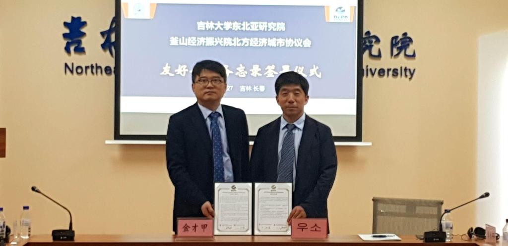 会议就东北亚地区物流旅游合作、中韩朝等国的经济合作方案、东北亚城市经济发展等议题进行广泛深入的交流和讨论, 会议取得了丰硕的成果。会后,韩国釜山经济振兴院北方经济城市协议会金才甲局长和东北亚研究院于潇经理作为双方合作单位代表签署了友好合作备忘录,双方表示将以此次研讨会为契机,推动双方进一步开展交流合作,建立高校、政府和企业间新的合作模式。