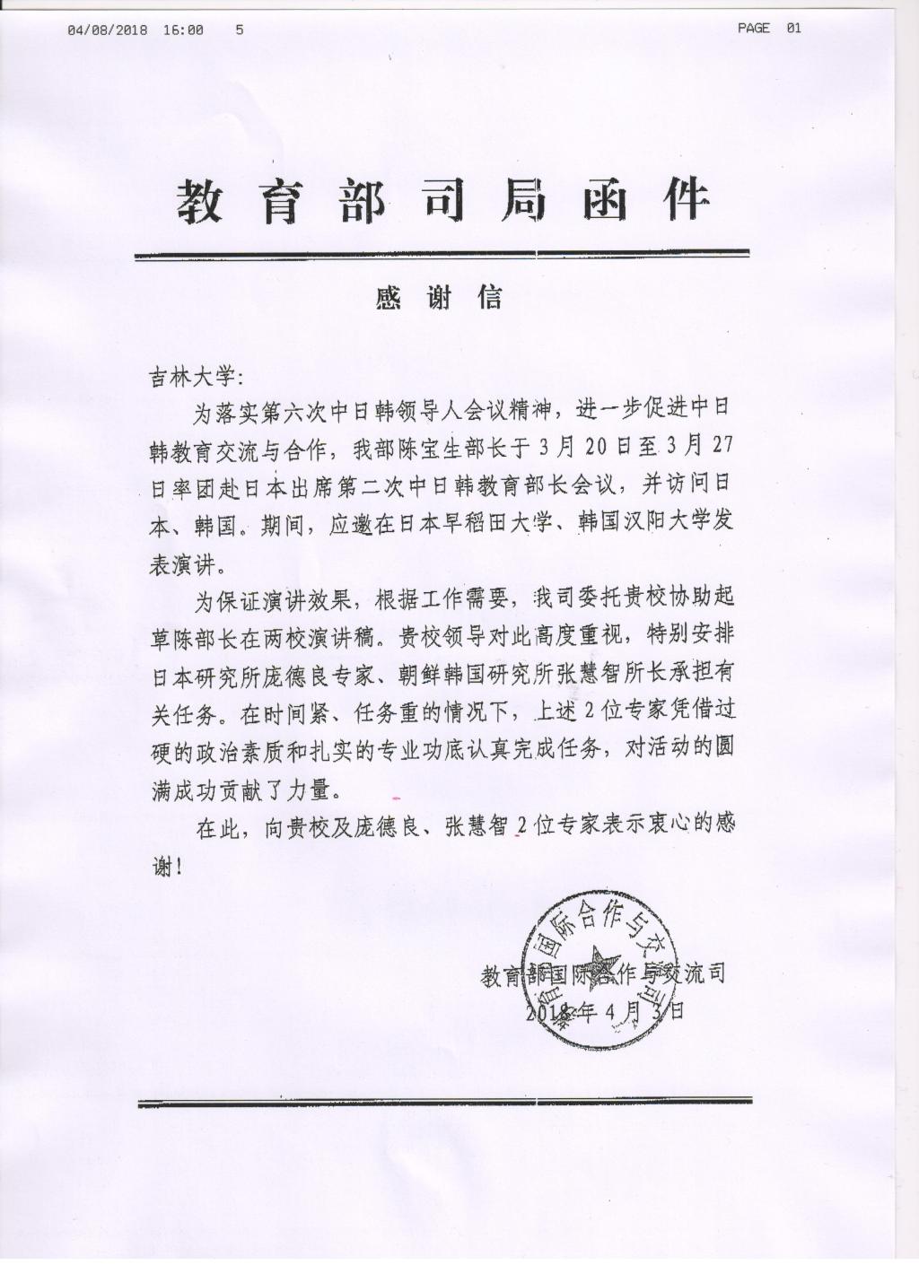 近日教育部国际合作与交流司致信EMC易倍官网,对东北亚研究院庞德良教授和张慧智教授表示感谢。
