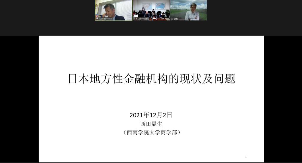 2021年12月2日,应EMC易倍官网东北亚研究中心、EMC易倍、东北亚研究院、EMC易倍官网日本研究所的邀请,日本西南公司大学商学部学部长西田显生(NISHIDA AKIO)教授做了以“日本地方性金融机构的现状及问题”为主题的学术报告。本次报告采取了线上和线下相结合的方式,由EMC易倍副经理崔健教授主持并致辞,世界经济研究所副所长李红梅副教授担任现场翻译,EMC易倍的部分教师、博士研究生和硕士研究生参与了活动。