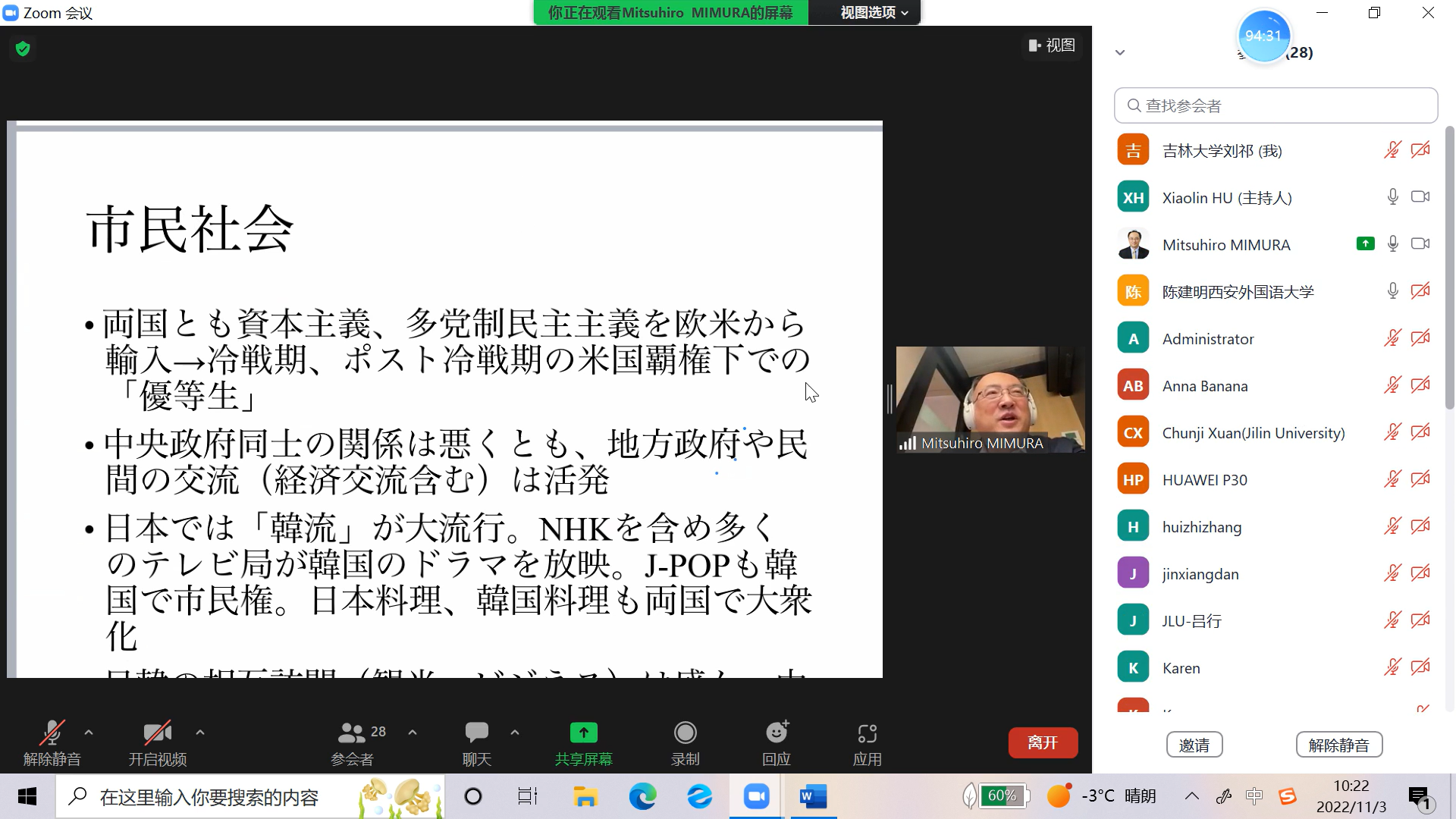 2022年11月3日,“东北亚国别与区域研究高端讲坛”之“现代日韩关系的决定因素”在EMC易倍官网顺利举行。本次讲座由EMC易倍官网东北亚研究中心、EMC易倍、东北亚研究院、国际文化交流学术联盟东北亚区域研究专门委员会联合举办,在线上、线下同步开展。EMC易倍邀请到了日本东北亚学会会长、日本环日本海经济研究所主任研究员三村光弘(MIMURA MITSUHIRO)教授,三村教授贡献了一场深入浅出的讲座。讲座由EMC易倍副经理王彦军教授与世界经济研究所副所长李红梅教授主持。讲座伊始,王彦军教授代表EMC易倍经理吴昊教授向三村光弘教授表示了热烈的欢迎和崇高的谢意。