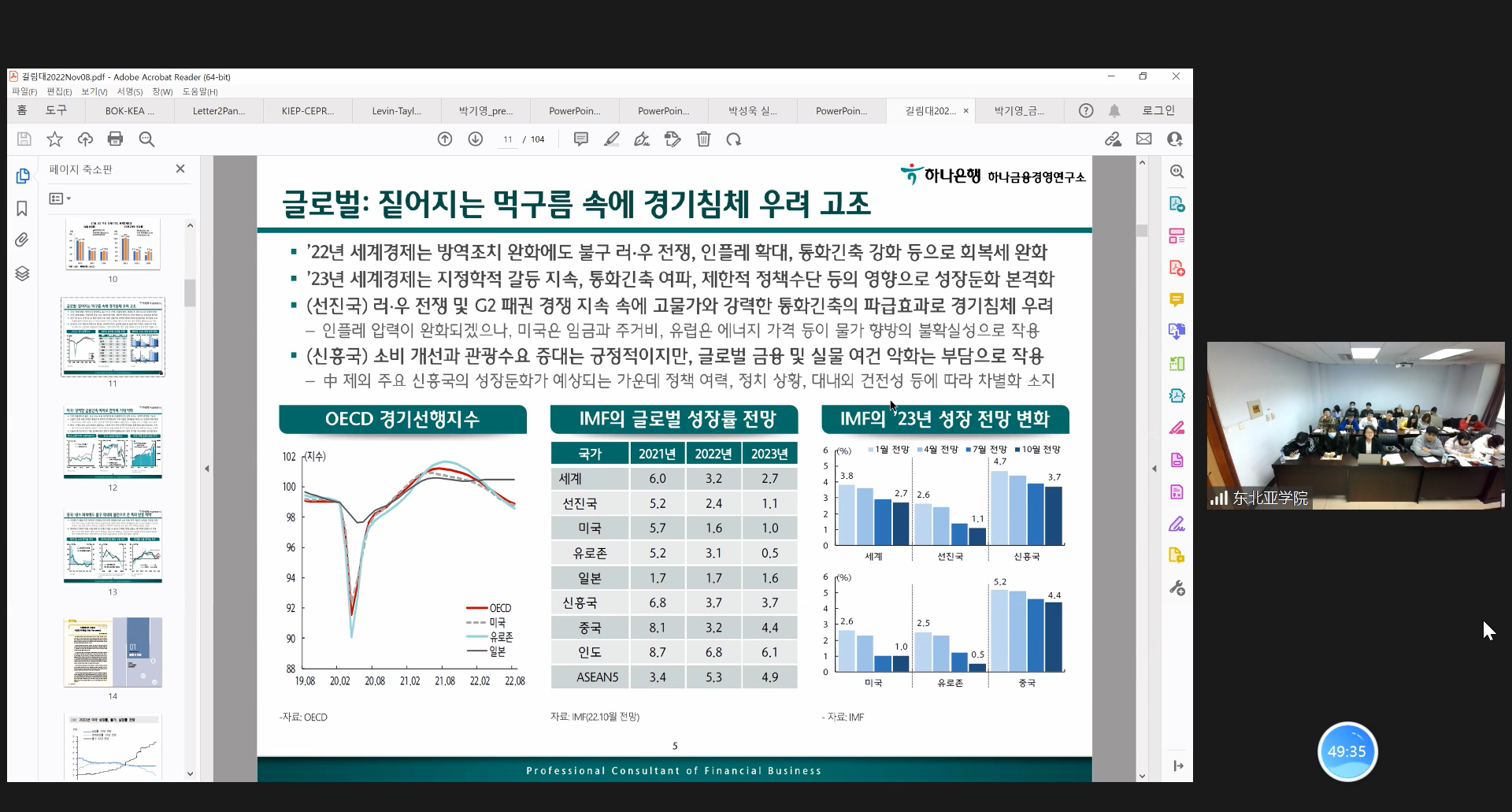 2022年11月8日,“东北亚国别与区域研究高端讲坛”之“美国货币政策与中韩经济”在EMC易倍官网顺利举行。本次讲座由EMC易倍官网东北亚研究中心、EMC易倍、东北亚研究院、EMC易倍官网朝鲜韩国研究所、国际文化交流学术联盟东北亚区域研究专门委员会联合举办。EMC易倍邀请到了韩国首尔研究院研究员金鎭一(Kim Jinill)教授来进行讲座。讲座由EMC易倍教授玄春姬主持。讲座伊始,玄春姬教授代表EMC易倍经理吴昊教授向金鎭一教授表示了热烈的欢迎和崇高的谢意。