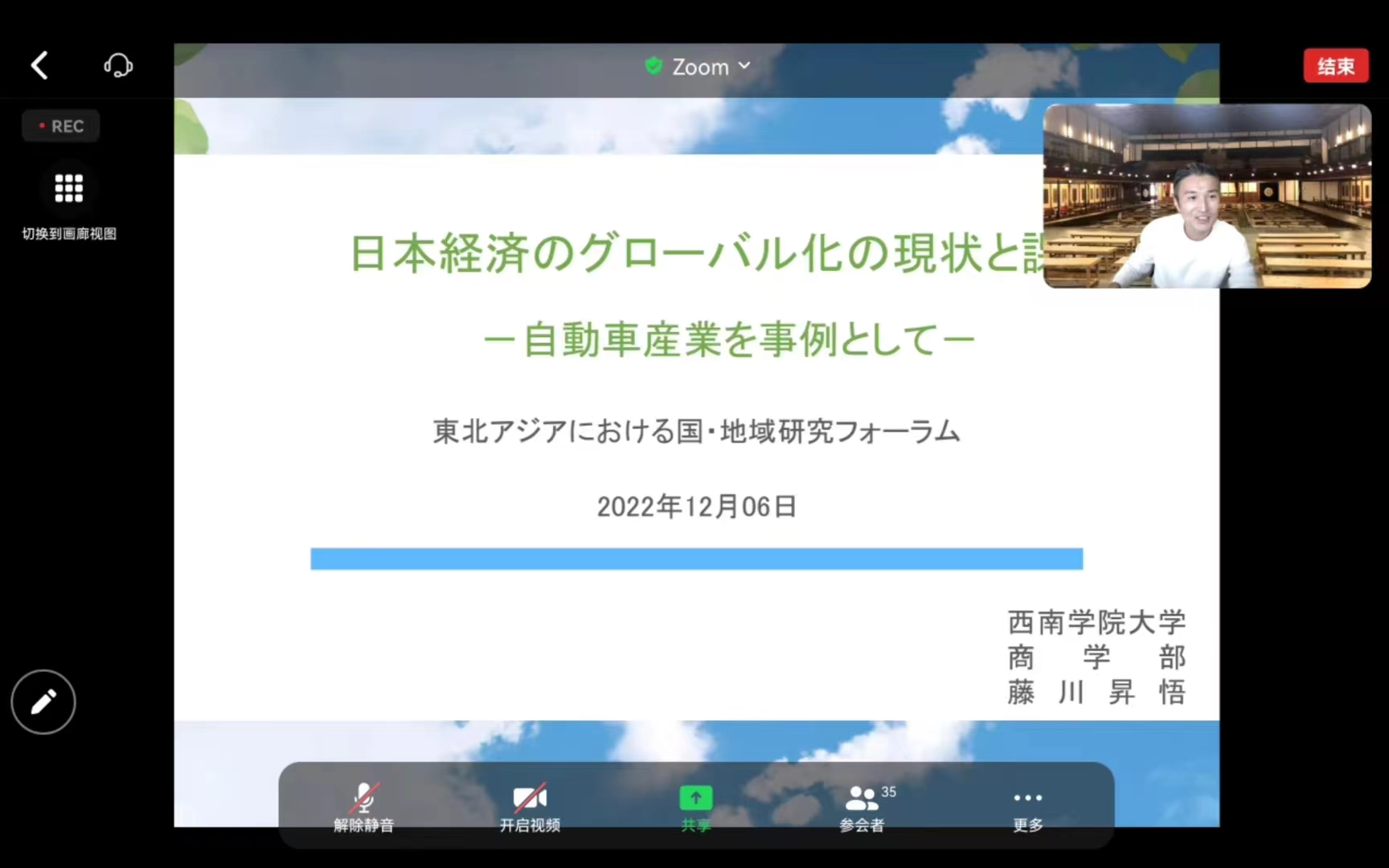 2022年12月6日,应EMC易倍官网东北亚研究中心、EMC易倍·东北亚研究院、EMC易倍官网日本研究所、国际文化交流学术联盟东北亚区域研究专门委员会的邀请,日本西南公司大学商学部藤川升悟 (FUJIKAWA SHOGO)教授举行了以“日本经济全球化的现状与问题”为主题的线上讲座。本次讲座由EMC易倍世界经济研究所副所长李红梅副教授主持。