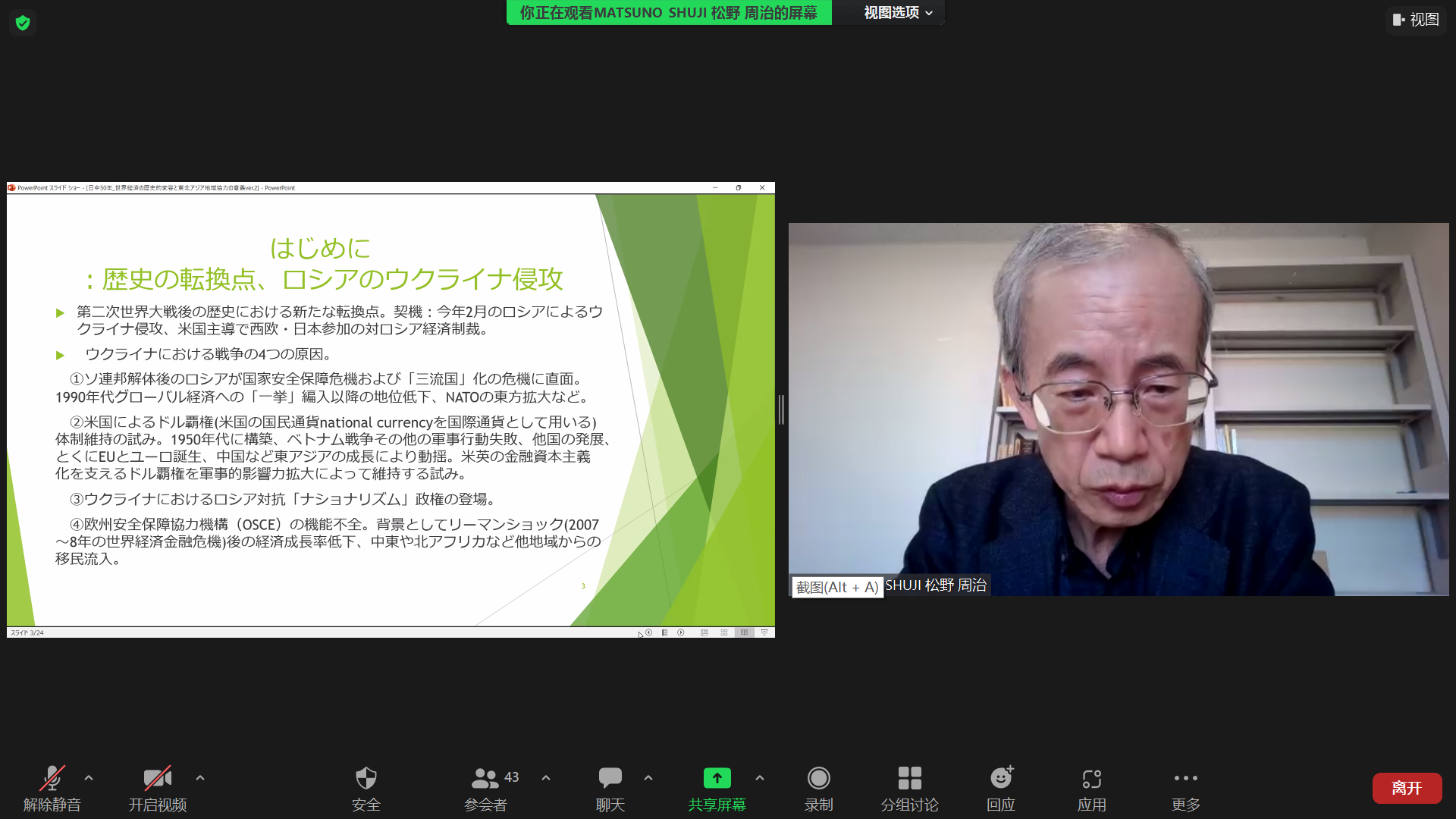 2022年12月9日,应EMC易倍官网东北亚研究中心、EMC易倍·东北亚研究院、EMC易倍官网日本研究所、国际文化交流学术联盟东北亚区域研究专门委员会的邀请,日本立命馆大学经济学部松野周治(MATSUNO SHUJI)名誉教授举行了以“ 中日50年-世界经济的历史转变与东北亚区域合作的意义”为主题的线上讲座。本次讲座由EMC易倍副经理王彦军教授主持。