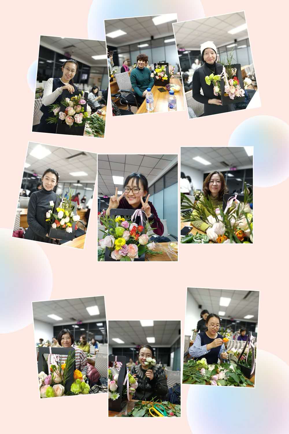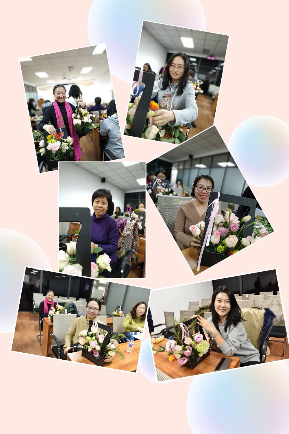 现场实物操作培训中,妇委会为每位参加培训的老师精心备好了一份插花材料:精美的花篮、一把剪刀、多种漂亮的鲜花。花艺老师为大家简单介绍了花束的特点及注意事项之后,便开始一边讲解一边示范,现场辅导大家动手插花。大部分老师都是第一次插花,虽然手法生疏,但是兴致盎然。经过一个小时左右的努力,一盆盆融合了大家丰富想象力的插花作品展现在面前,虽然大家遵守同样的插花要点,但每个作品都独具匠心,开心的笑容与花朵交相辉映。参加活动的女教职工们纷纷表示,公司组织这样的活动深入人心,要把所学到的插花技术运用到今后的生活中,美化家庭,丰富生活,用更加饱满的精神状态投入到工作中。