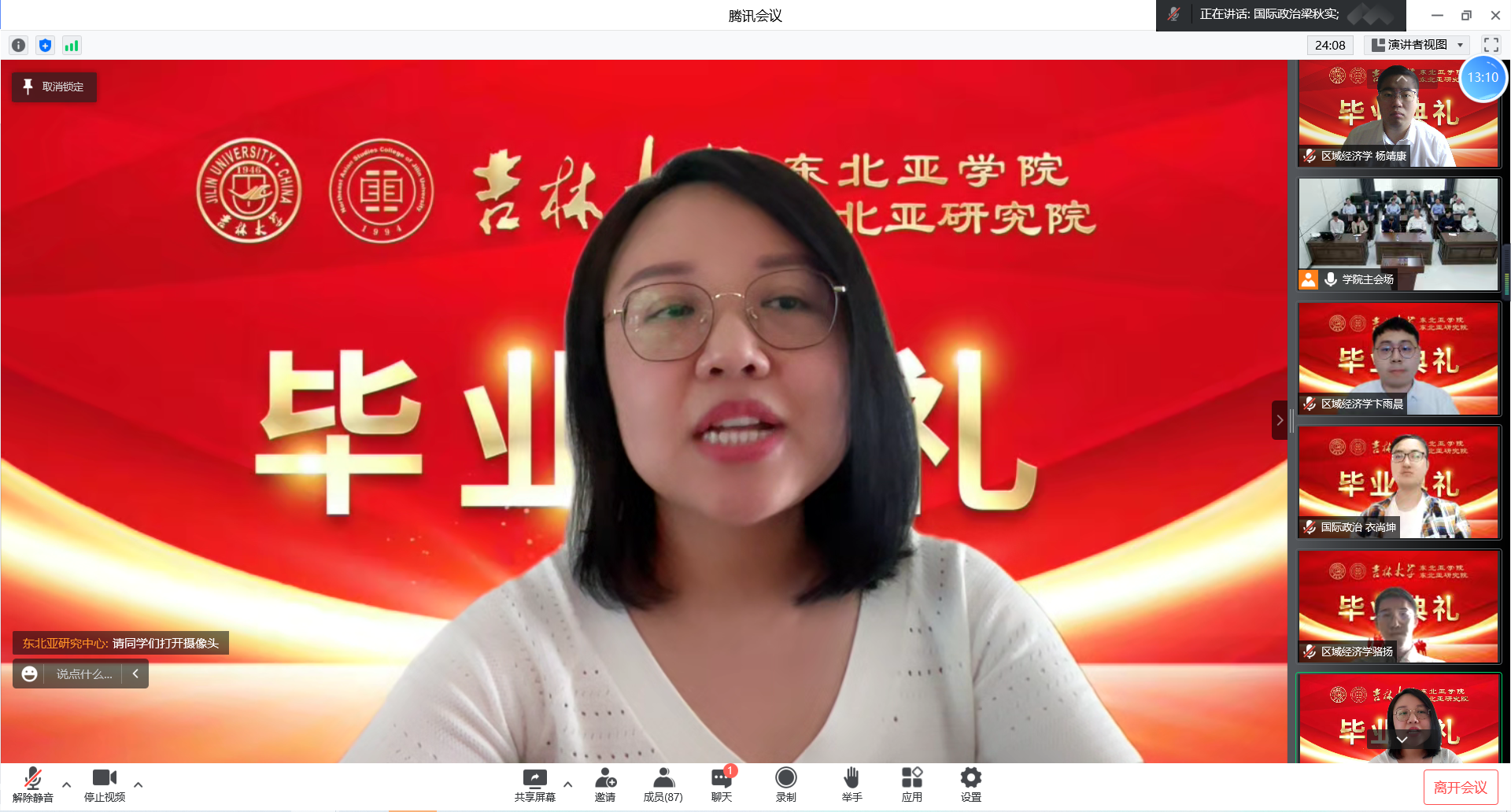 博士毕业生代表梁秋实同学和硕士毕业生代表卞雨晨同学都表达了对公司和老师们感恩之情,表达了对同窗之间深厚情谊的不舍之情,并表示会牢记“求实创新,励志图强”的吉大精神,牢记老师们的谆谆教诲,无论未来去往何处,都会展现吉大人,展现东北亚学子的风采。