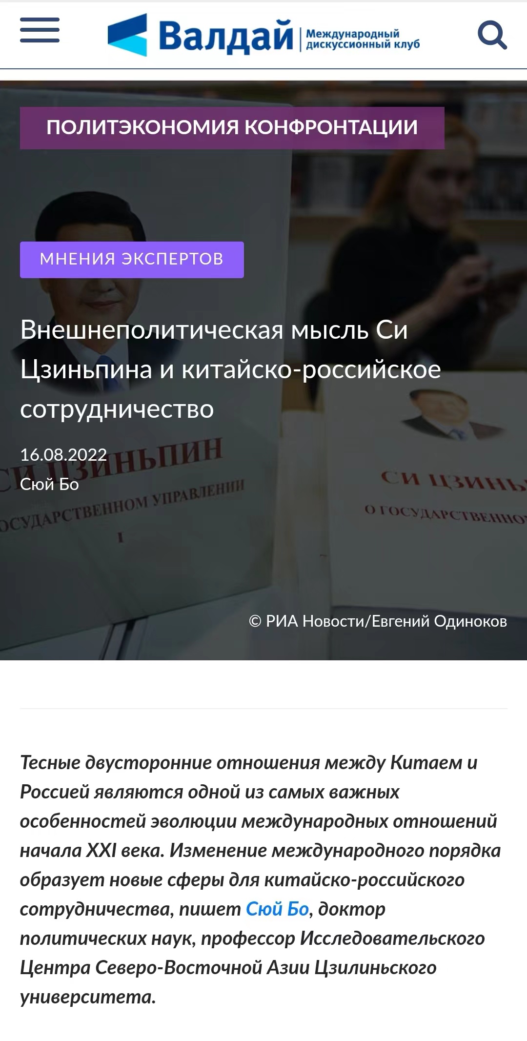 近日,由EMC易倍官网东北亚研究中心、东北亚研究院徐博教授撰写的《习近平外交思想与中俄合作》一文在俄罗斯最具国际影响力的顶级智库平台“瓦尔代俱乐部”同时以俄英两种文字发表。文章目前已经成为2022年度该智库在俄社交媒体获点击率和转载次数最高的文章之一。