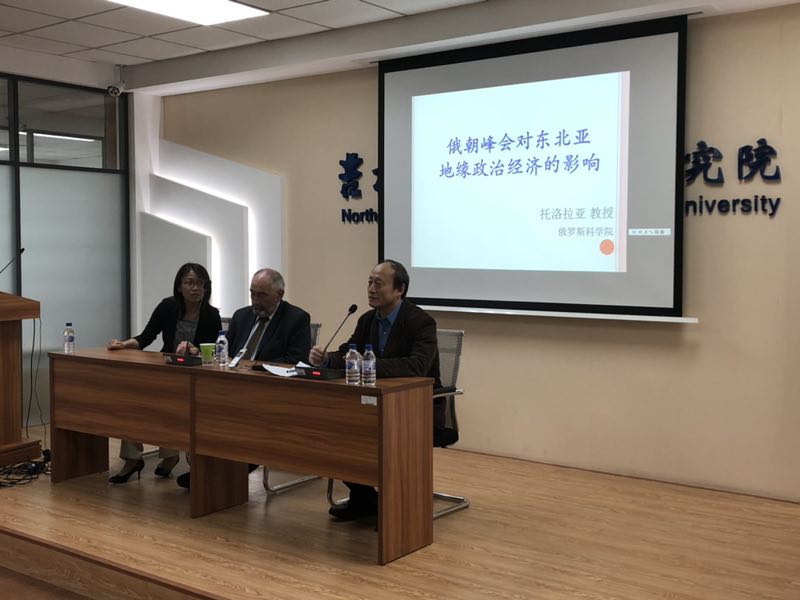 2019年5月10日,俄罗斯著名朝鲜问题的国际权威专家、俄罗斯科公司教授托洛拉亚应东北亚研究院中俄区域合作研究中心的邀请,在东荣大厦B215会议室举办了以“俄朝峰会对东北亚地缘政治经济的影响”为主题的学术报告会。报告由中俄区域合作研究中心主任,朱显平教授主持,外语公司万冬梅老师担任现场翻译。东北亚研究院部分师生参加了报告会。