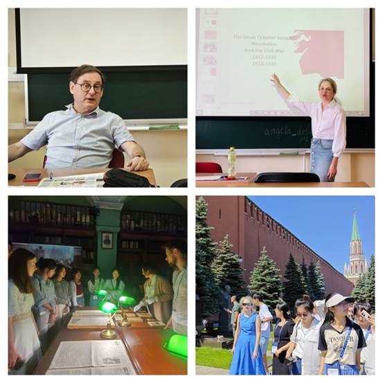 在历史与文化讲座中,多尔戈瓦·安吉拉教授讲述了俄罗斯联邦的古代起源,从基辅罗斯时期讲起,介绍了留里克王朝时期的政治、经济制度;在学习罗曼诺夫王朝时期和苏联时期的历史时,多尔戈瓦·安吉拉详细讲解了多位沙皇、苏联领导人的政治、经济政策,包括彼得一世的改革、叶卡捷琳娜二世的开明专制,以及苏联时期进行的多次经济改革。针对部分学习内容,多尔戈瓦·安吉拉教授带领同学们前往红场等地进行实地教学。师生共同参观了多处历史建筑物、瞻仰列宁遗体,伴随着红场上曲调独特的钟声,同学们对红场相关的历史事件、历史人物的理解更为深入、全面,有效加深了理解与记忆。